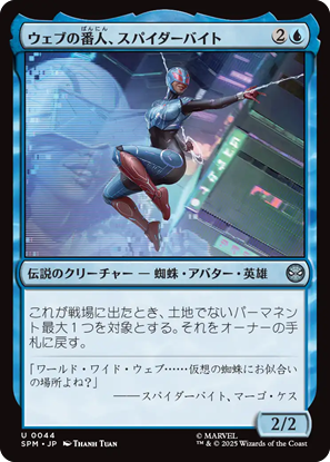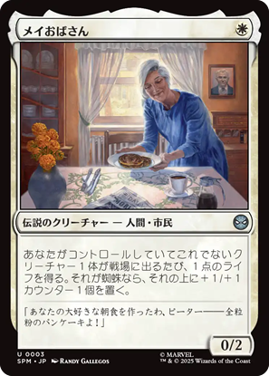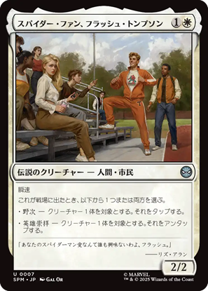 固有色「白単色」で統率者にできるカードは11枚。スパイダーマン多めの印象ですが、脇を固める重要人物「メイおばさん」や「MJ(メリージェーン)」なんかも居ます。スパイダーマンのファンですら伝説なのかスゲーと思って、少し調べたらフラッシュ・トンプソンは割と重要な人物でした。