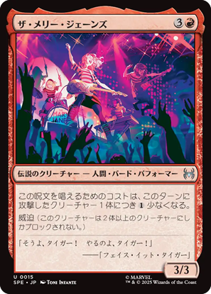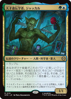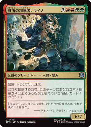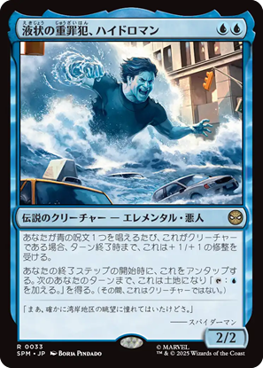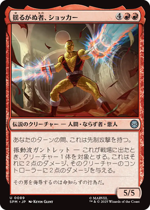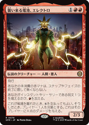 「赤」単色には11枚の統率者が収録。感情の色だからなのか、ヒーローとヴィランが入り混じってます。この中で注目しているのが《襲い来る電池、エレクトロ》。身体に蓄電するように、ひたすらインスタント・ソーサリーでマナ加速して、触れたら爆発します。みたいなネタデッキを組みたい。
