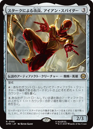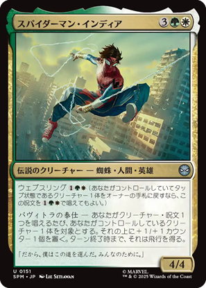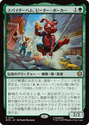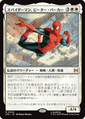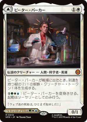 統率者にして楽しそうだなと思ったのは《スパイダーマン、ピーター・パーカー》。ライフ回復で+1/+1カウンター置くのは、よくある能力ですが、破壊不能まで付けちゃうのは期待大。
