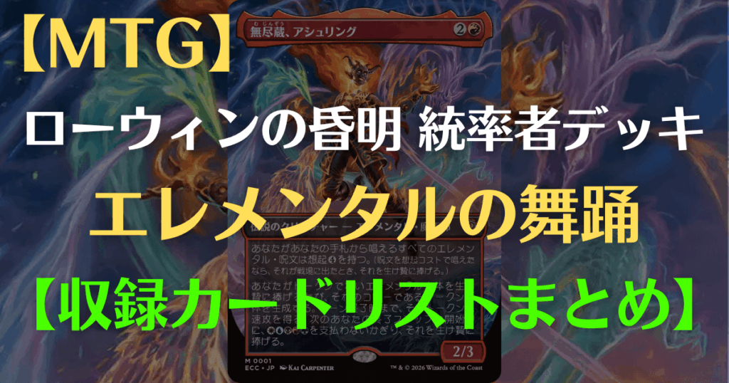【MTG】ローウィンの昏迷 統率者デッキ『エレメンタルの舞踊』《無尽蔵、アシュリング》収録カードリストまとめ【EDH】 2か月前 発売日2026年1月23日の統率者デッキ《エレメンタルの舞踊》のデッキリストがマジック:ザ・ギャザリング公式サイトに掲載されていましたのでまとめました。 統率者デッキ「エレメンタルの舞踊」 統率者は《無尽蔵、アシュリング […]